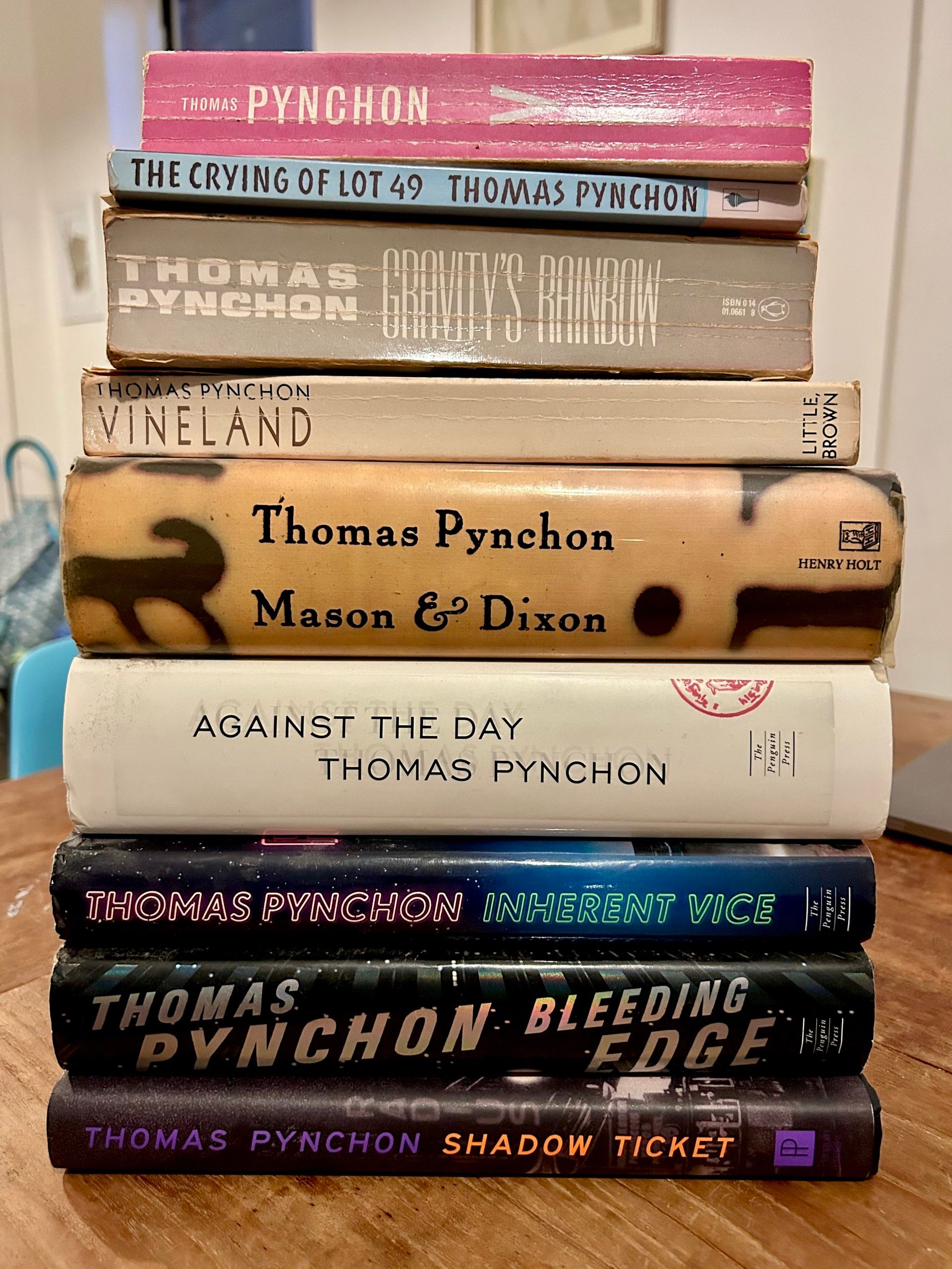 In the last 30 years, Pynchon has gone from celebrated but obscure to enormously celebrated and slightly less obscure. Where he used to publish so rarely that his fans sought evidence of his existence in Letters to the Editor he may or may not have written, under a bag-lady pseudonym, to a small California newspaper, he’s now put out five novels since 1997: Mason & Dixon, Against the Day, Inherent Vice, Bleeding Edge, and the just-released Shadow Ticket. Though he has maintained his aura of secrecy, he’s also managed to live a public life, writing liner notes for bands he likes, “appearing” on The Simpsons, and existing in New York City in a trackable way, if you care to track him. His literary reputation and cultural influence have only grown, while his brand of paranoia and his obsessions (pop culture, science, the shadows of history) have become mainstream America’s. The best movie of 2025, One Battle After Another, is a loose adaptation of Vineland, and it is so, so good. You should see it.